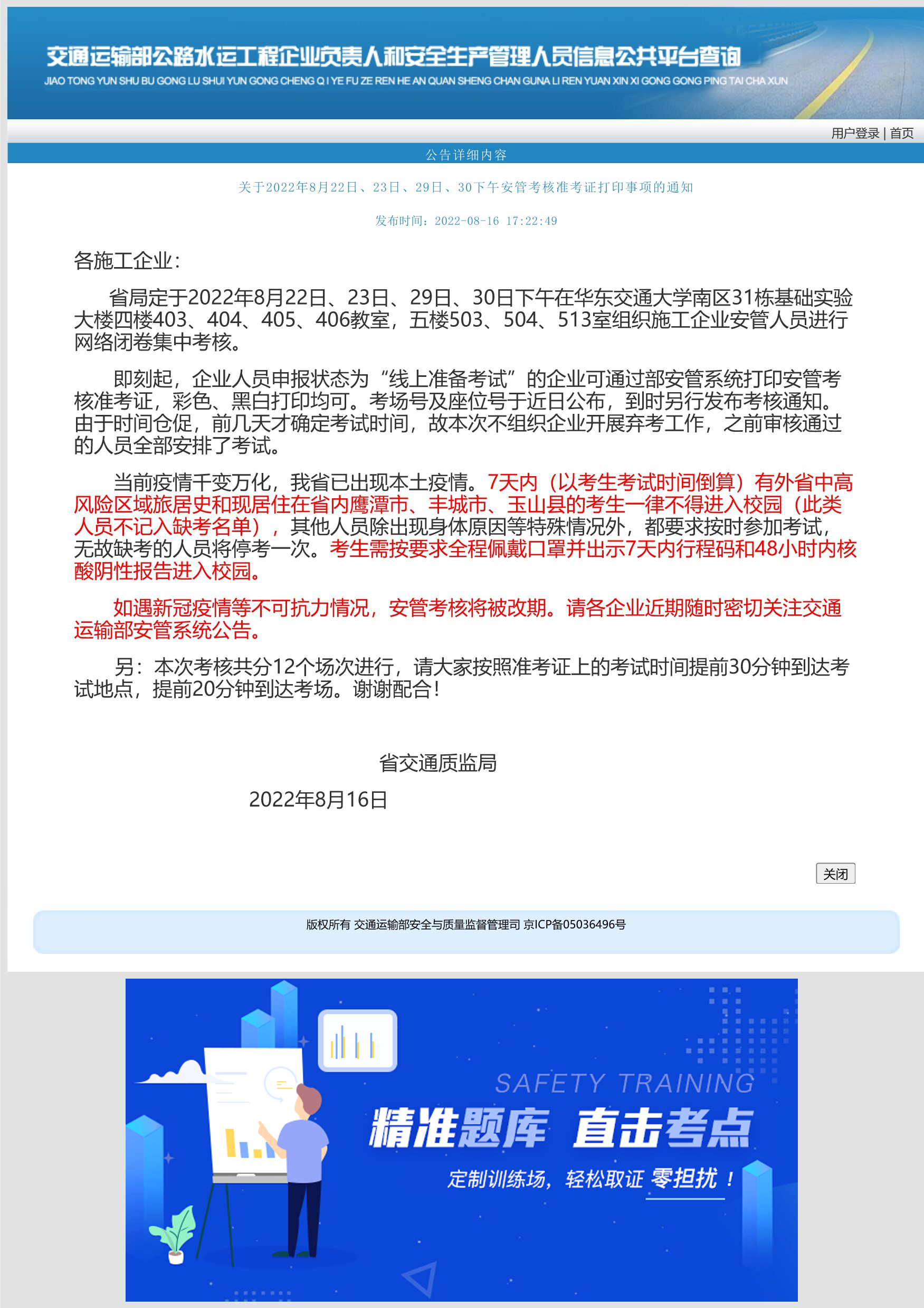 省局擬定于2022年8月22日、23日、29日、30日下午在華東交通大學(xué)南區(qū)31棟基礎(chǔ)實(shí)驗(yàn)大樓四樓403、404、405、406教室,五樓503、504、513教室組織我省施工企業(yè)安管人員進(jìn)行網(wǎng)絡(luò)閉卷集中考核。如遇新冠疫情等不可抗力情況,安管考核將被改期。請(qǐng)各企業(yè)近期隨時(shí)密切關(guān)注部安管系統(tǒng)公告。現(xiàn)將考核相關(guān)事項(xiàng)通知如下: 1.因?qū)W校是防疫重地,造成公共衛(wèi)生安全事件的隱患極大,請(qǐng)各位考生一定自覺遵守華東交通大學(xué)疫情防控措施。7天內(nèi)(以考生考試時(shí)間倒算)有外省中高風(fēng)險(xiǎn)區(qū)域旅居史和現(xiàn)居住在省內(nèi)鷹潭市、豐城市、玉山縣的考生一律不得進(jìn)入校園(此類人員不記入缺考名單)。考生需按校園疫情管控要求全程規(guī)范佩戴口罩,嚴(yán)格執(zhí)行“一測(cè)一掃三查驗(yàn)”(即測(cè)體溫,掃單位碼,查驗(yàn)健康碼、行程碼和核酸檢測(cè)陰性證明【南昌市內(nèi)考生提供考前24小時(shí)內(nèi)核酸檢測(cè)陰性證明;南昌市外考生需落實(shí)三天兩檢,提供考前72小時(shí)內(nèi)2次核酸檢測(cè)陰性證明】)。 若考生存在7天內(nèi)(以考生考試時(shí)間倒算)有外省中高風(fēng)險(xiǎn)區(qū)域旅居史和現(xiàn)居住在省內(nèi)鷹潭市、豐城市、玉山縣及出現(xiàn)身體原因等特殊情況不能來參加考試的,請(qǐng)企業(yè)工作人員將蓋企業(yè)公章的情況說明發(fā)至1512237261QQ郵箱。 2.為保證考試順利進(jìn)行,請(qǐng)各企業(yè)下載本考核通知的附件《考生須知》和《考生承諾書》。企業(yè)應(yīng)向考生宣貫《考生須知》;并由考生本人填寫《考生承諾書》,進(jìn)入考場(chǎng)后交給監(jiān)考老師統(tǒng)一收取存檔,事后不接受補(bǔ)交。未提交《考生承諾書》的,取消當(dāng)次考試成績,按缺考人員處理。 3.考生必須攜帶本人準(zhǔn)考證和有效身份證件(居民身份證或臨時(shí)身份證、軍官證、 港澳臺(tái)通行證、護(hù)照、戶籍證明)方可參加考試。 4.考生準(zhǔn)考證上的姓名、身份證號(hào)存在錯(cuò)誤信息的,考前考生必須按照準(zhǔn)考證上的姓名和身份證號(hào)輸入,將錯(cuò)就錯(cuò),否則調(diào)取不到試卷。待考試通過核發(fā)證書后,由企業(yè)工作人員通過部安管系統(tǒng)更正正確的個(gè)人信息。 5.本次安管考核共分12個(gè)場(chǎng)次進(jìn)行。請(qǐng)考生按準(zhǔn)考證開考時(shí)間提前20分鐘有序進(jìn)入指定考場(chǎng),開考20分鐘后,遲到考生禁止進(jìn)入考場(chǎng)。 6.考生座位表考前會(huì)張貼在考場(chǎng)走廊及考場(chǎng)門口。 7.考生須知,考生承諾書,考試時(shí)間、地點(diǎn)及乘車路線,安管考核名單及考場(chǎng)安排詳見附件。由于安管系統(tǒng)準(zhǔn)考證信息設(shè)置功能受限,請(qǐng)企業(yè)工作人員將考生的考場(chǎng)號(hào)填寫在準(zhǔn)考證上,以便考生順利進(jìn)入考場(chǎng)。 8.嚴(yán)明考試紀(jì)律,從嚴(yán)查處 (1)考生嚴(yán)禁隨身攜帶手機(jī)等電子產(chǎn)品,自行準(zhǔn)備好背包或文件袋。考前進(jìn)行身份核驗(yàn)的同時(shí),接受掃描儀的檢查;背包或文件袋放在監(jiān)考老師指定的監(jiān)控視頻區(qū)域,監(jiān)考老師不負(fù)責(zé)看管物品。 (2)考試結(jié)束后,由監(jiān)考老師登記考試成績,考生簽到簽退后,整個(gè)考試流程結(jié)束方可離開考場(chǎng),否則考試成績無效。 (3)考生提交試卷時(shí),電腦出現(xiàn)黑屏或亂碼的情況,應(yīng)由工作人員、考生雙方當(dāng)場(chǎng)登錄交通運(yùn)輸部安管系統(tǒng)查詢考試成績后,由考生補(bǔ)登考分。 (4)考試成績現(xiàn)場(chǎng)經(jīng)過考生確認(rèn),監(jiān)考考師登記后,事后考試組織部門不接受申訴。 (5)考生故意擾亂考點(diǎn)、考場(chǎng)等考試工作場(chǎng)所秩序或威脅、辱罵監(jiān)考老師的,責(zé)令離開考場(chǎng);影響考試正常進(jìn)行,違反《中華人民共和國治安管理處罰法》的,交由公安機(jī)關(guān)依法處理。 (6)發(fā)生替考、代考等考試舞弊行為的人員,依據(jù)《江西省公路水運(yùn)工程施工企業(yè)主要負(fù)責(zé)人和安全生產(chǎn)管理人員考核管理實(shí)施細(xì)則》第十七條款規(guī)定,給予取消當(dāng)次考試成績,并記入安管人員考核誠信檔案,3年內(nèi)不受理其考核申請(qǐng)的處理。 (7)存在以下兩種情形之一的,說明考生存在場(chǎng)外考試的情況,給予取消當(dāng)次考試成績的處理。 ①監(jiān)考記錄上考生未簽到簽退、未登記考試成績,但交通運(yùn)輸部安管系統(tǒng)又顯示其考試已通過; ②監(jiān)考記錄上登記的考試成績不合格,但交通運(yùn)輸部安管系統(tǒng)又顯示其考試已通過。 此考核通知同時(shí)通過交通運(yùn)輸部安管系統(tǒng)和本工作群發(fā)布,請(qǐng)企業(yè)相互通知。謝謝! 附件一 《考試地點(diǎn)、時(shí)間及乘車路線》 附件二 《考生須知》 附件三 《考生承諾書》 2022年8月22日、23日、29日、30日下午各場(chǎng)次考試人員名單及考場(chǎng)安排隨本考核通知一并公布。 省交通質(zhì)監(jiān)局 2022年8月18日 |
